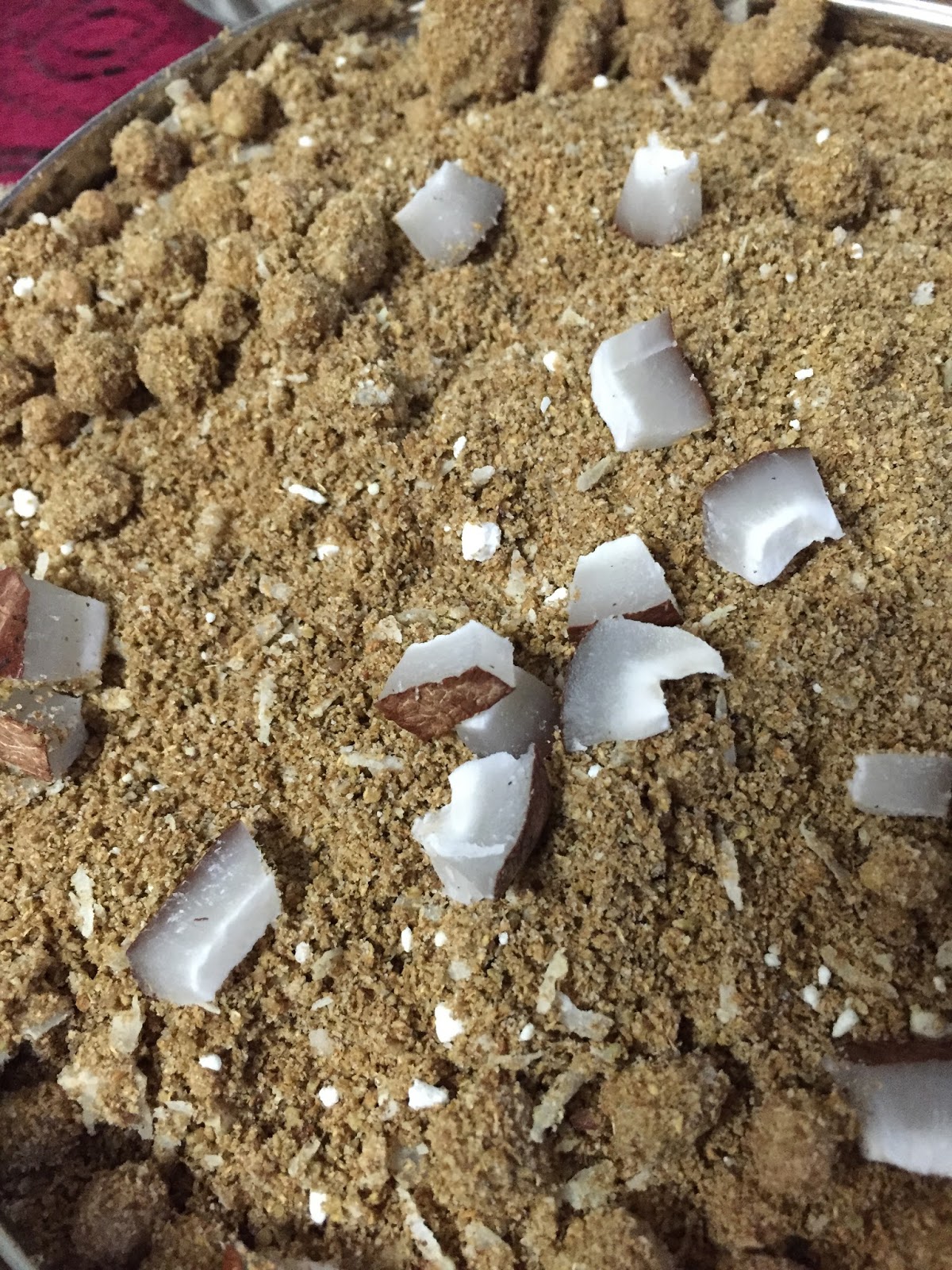 Krishna is Dhaniya Panjiri. The texture of the dish is like flowing sand but